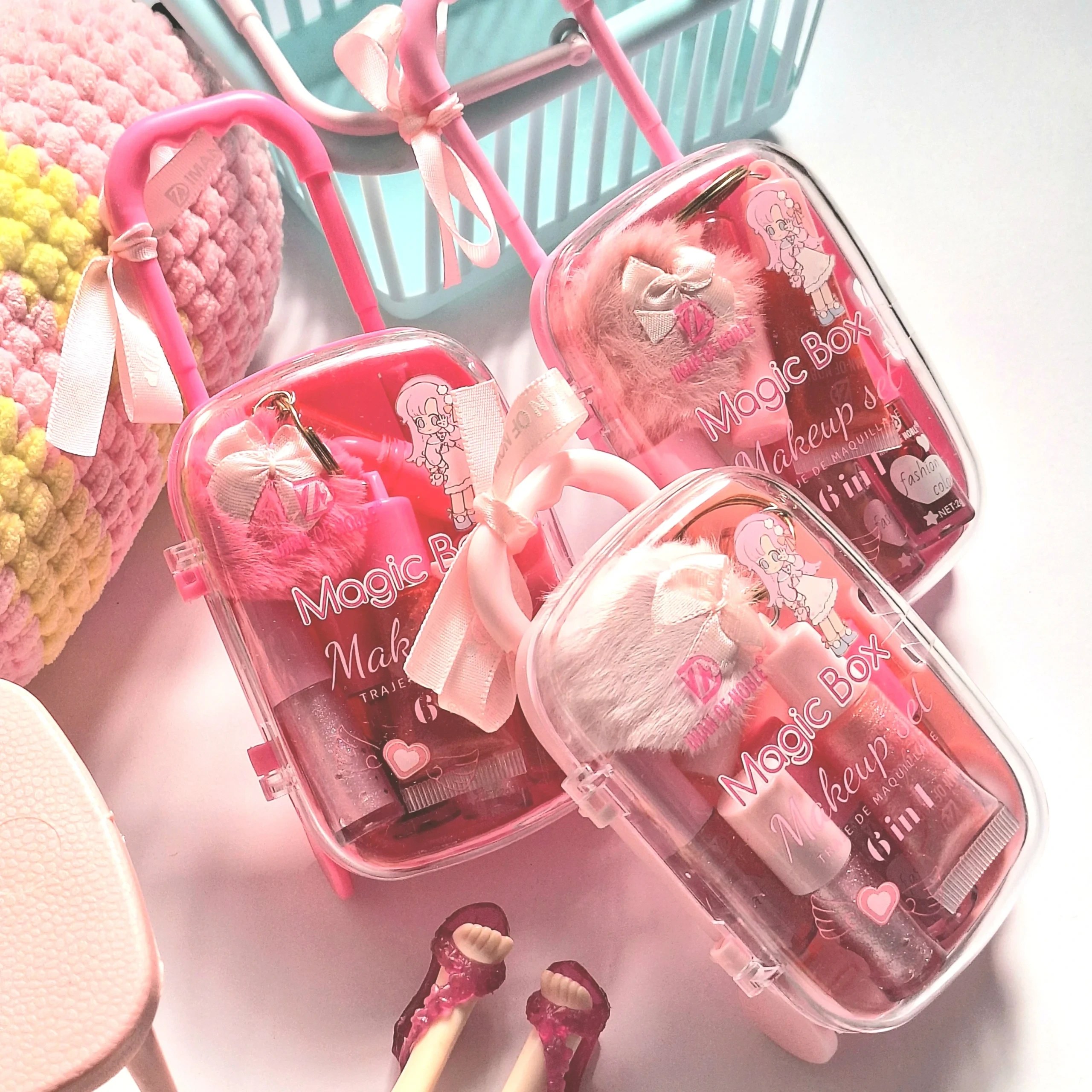پک آرایشی چمدان فانتزی دخترانه ، شامل برق لب ، لیپ گلاس ، رژلب ، پک کادویی فانتزی دخترانه جذاب