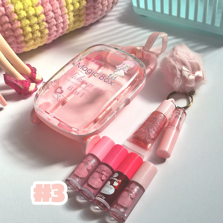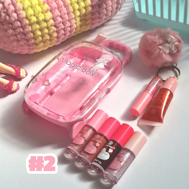 پک آرایشی چمدان فانتزی دخترانه ، شامل برق لب ، لیپ گلاس ، رژلب ، پک کادویی فانتزی دخترانه جذاب