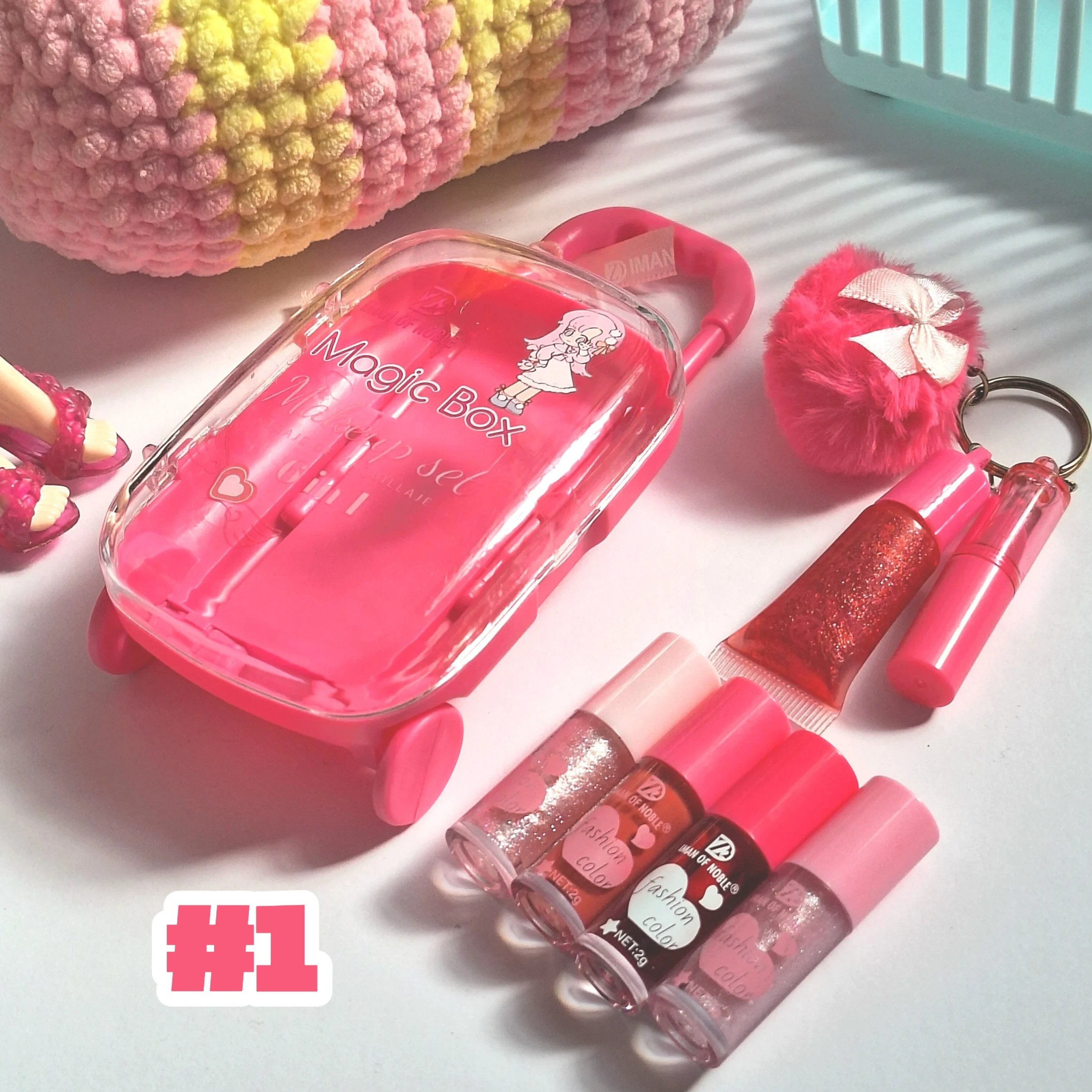 پک آرایشی چمدان فانتزی دخترانه ، شامل برق لب ، لیپ گلاس ، رژلب ، پک کادویی فانتزی دخترانه جذاب